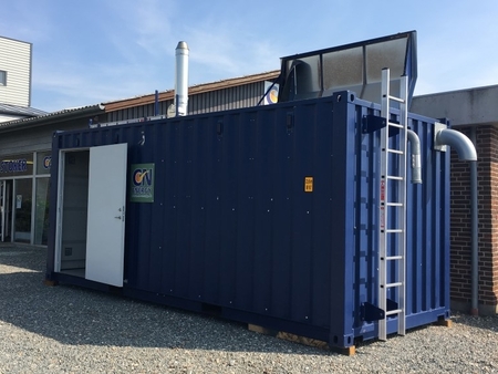 Nyere, brugt containeranlæg 60 kW med HDG-pillekedel og indbygget pillemagasin på 9 m3.